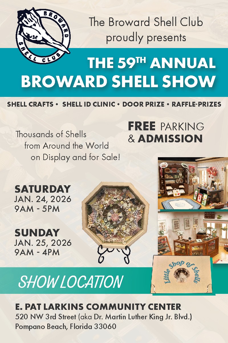 Meetings are held the 2nd Wednesday of each month at the Emma Lou Olson Civic Center, 1801 N.E. 6th Street, Pompano Beach, Florida 33060, 954-786-4111.Doors open at 6:30pm when all can enjoy the Raffle Table, Sand Flea Market, and Library. Buy a raffle ticket to for a chance to win the Shell of the Month Everyone is welcome