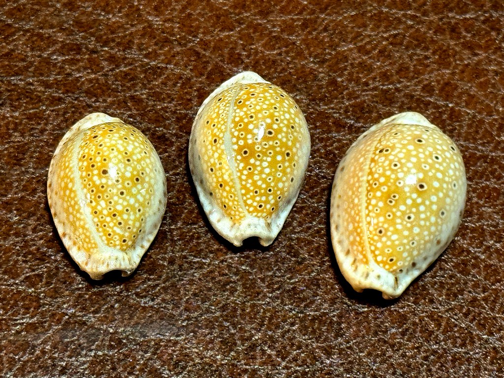 SHELL OF THE MONTH JANUARY 2026 Set of three. Cypraea ocellata Linnaeus, 1758. The Ocellated Cowry. Beautiful little gens from the Andamen sea off the coast of Myanmar. Great location for the specien collecrs!. These shell are about 23 mm in size, gem condition and were collect by Thai fishermen. An uncommon specie found in isolated locations in the Gulf of Bemgal. Attend the January meeting for a chance to win these beauties!