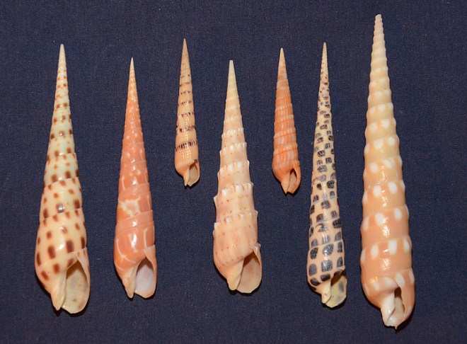 Terebra are closely related to Conus and Turris. They all have a poison apparatus to kill their prey. Terebra feed mainly marine worms. Terebra live worldwide, with most species in the Indo-Pacific region. Terebra is one of four genera in Terebridae, the others being Hastula, Duplicaria and Impages. Many of the smaller species are near impossible to identify. The largest specimen presented in this group just over 5″ and the smallest is 2 1/2″. Terebra maculata, LInné 1758, not offered here is far and away the largest growing Terebra reaching a size of 10″. In Florida we have Terebra taurinus, Lightfoot 1786 which grows to 5″ and Terebra floridanus, Dall, 1889 which grows to 3″ plus several dozen much smaller species.