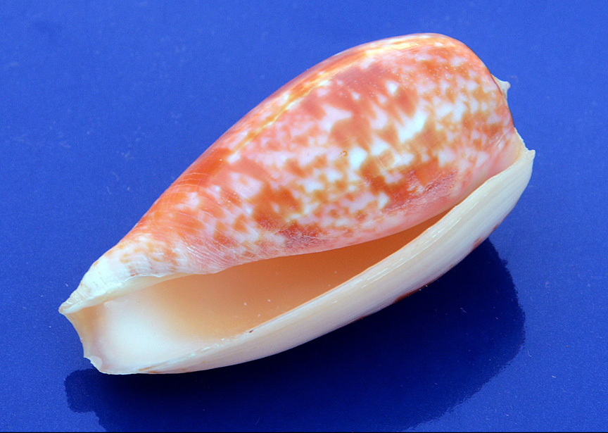 Conus bullatus, Linne, 1758 is Fay’s Shell of the Month for June 2011. It is a most attractive cone, with its bright orange/red color, high gloss and distinctive shape. Do you know why the aperature is so wide in this cone? Conus bullatus is a member of group called bubble cones because of their common shape. The wide aperature is because the snail is piscivores. It eats fish and quite large ones too. Conus bullatus lies burried in the sand with just its proboscis extended. When it senses a fish in the vicinity it goes into action, launching a harpoon that paralyzes the fish. Next the snail extends its mouth and sucks in the fish whole. “This species of cone snail immobilizes its prey in a split second with lightning-strike cabal toxins,” states the Howard Hills Medical Institute on its web site. You can see Conus bullatus feeding in videos on Youtube or theconesnail.com We recommed this web site to learn more about the eating habits of Conus bullautus and other cones. Much research has been done on the venom of Conus bullatus. “Characterization of the Conus bullatus genome and its venom-duct transcriptome” by Hu H is the main technical writing available on the web. Why would one be inerested? Because scientists are looking at conus venom for possible use in human medicine.