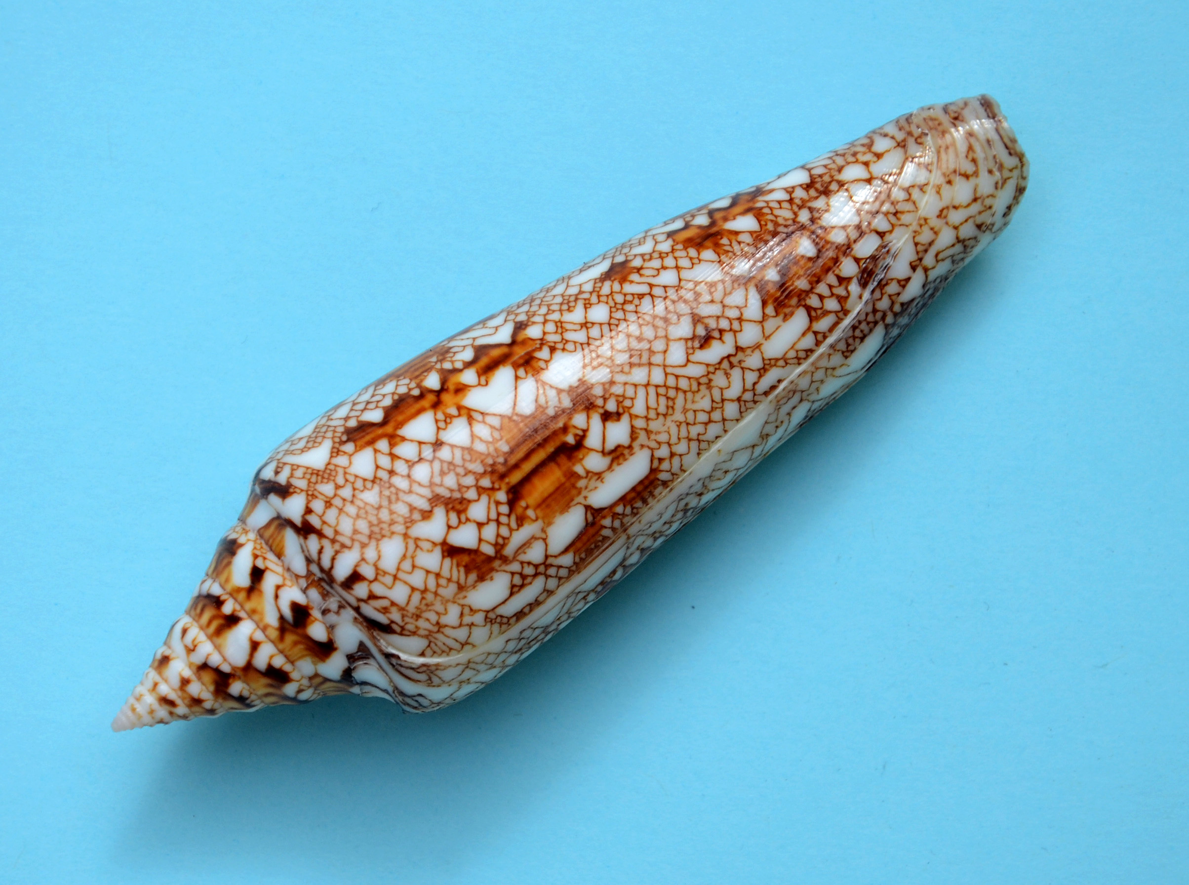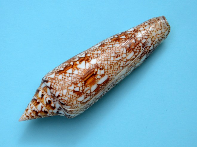 One has to wonder where this shell was hiding for so long as it was not known until 1968. The Bengal Cone is a member of the group of textile cones, which many consider the most beautiful of all shells. It is very similar to Conus gloriamaris and possibly confused. It is large, elongate, glossy and of course tented. There are two populations of Conus bengalensis. The first is from its namesake location, India’s Bay of Bengal. The other is from the Andaman Sea off the coast of Thailand. The Andaman Sea populations tend to have an elongated tapering spire giving the shell an elegant appearance. Our shell of the month is just such a specimen. The India populations commonly have a compressed spire and sometimes slightly concave sides. As with most large cone shells, growth comes in spurts resulting in growth lines running the length of the shell. Looking closely at this specimen one can see where where growth stopped and started. Many specimens have ugly scars where breaks in the shell has healed, not this one. Our specimen is about 93mm is length making it average in size, fully adult and with a mature thick lip. It would sell for $50-70 at retail. Larger specimens can easily bring double the price.