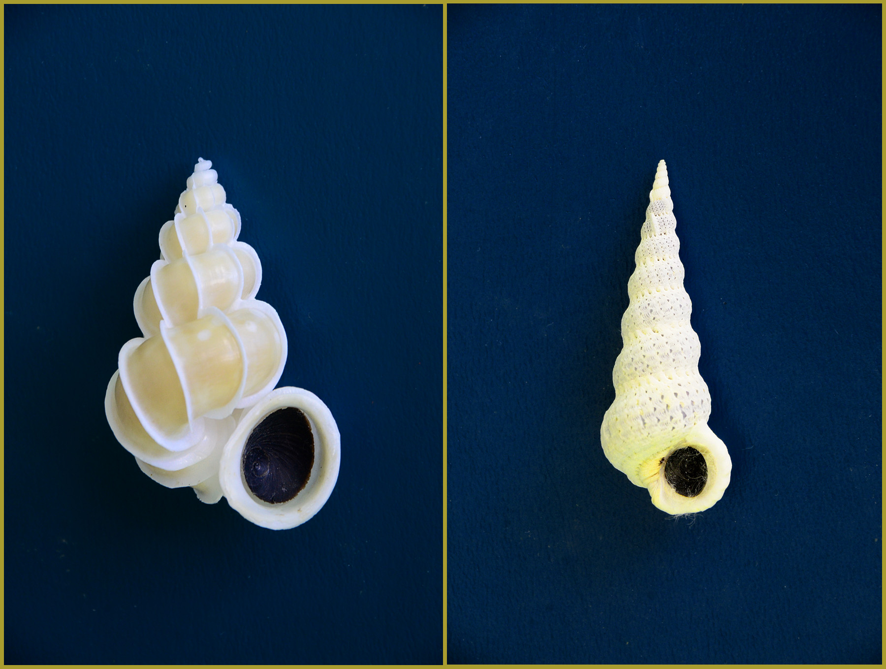 For November we have a very special pair of shells, two cousins – one is very famous and the other quite obscure and seldom seen. Epitonium scalare, Linne 1758 is the Precious Wentletrap, a shell of incredible beauty that hundreds of years ago was so precious it graced the cabinets of emperors and queens. It’s extreme rarity led the Chinese to make fabulous fakes from rice paste. The name Wentletrap comes from a Dutch word meaning spiral staircase and it is indeed an accurate description. Epitonium scalare’s whorls do not touch each other while its extended ribs form the the staircase. It has a porcelain surface.