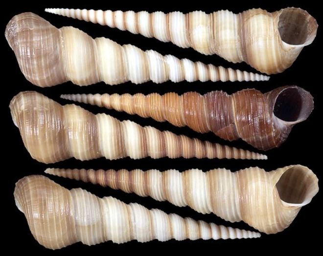 Commonly 5-7cm, they can can grow to 15-17cm long. Turritella terebra is a very tall elegant shell with regular spirals which are finely ridged. The color ranges from cream to chocolate brown with all shades in between. It is the largest of Family Turritellidae where most are small and seldomly collected.