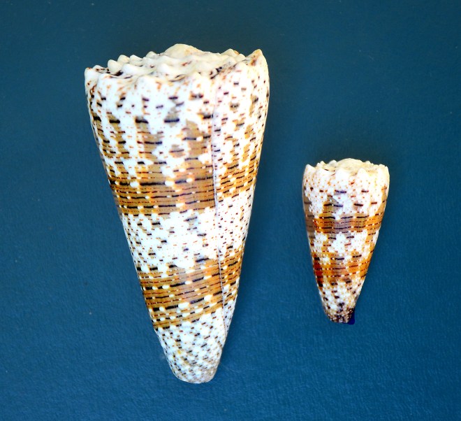Specimens from off the coast of Africa are smaller and tend to have the golden bands replaced by irregular axial blotches. They are ofter tan rather than gold and the base color could be grayish. They were given the name of Conus fuscatus Born 1778.