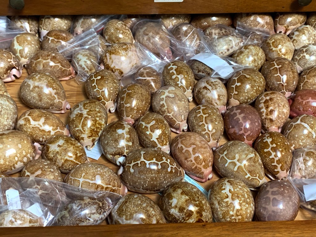 No collection of Cypraea is complete without at least one specimen pf the Mao Cowry. It’s large size and unique map pattern make it one of the most stunning of all shells.UThe dorsum is beige in color completely covered by aa brown lineate pattern and a large ”map” formed where the mantle meets.