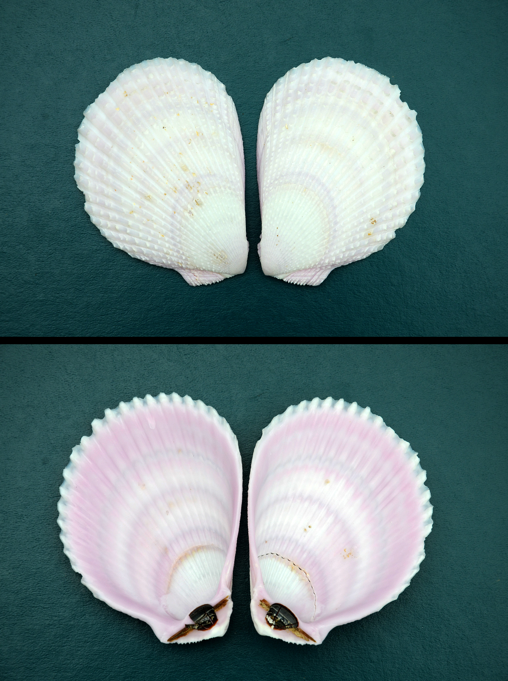 Our feature shell for this month is supplied by Emmett and James Redding with a shell(s) from the Jean Redding collection. The beautiful Murex melanoleucus Morch 1860 was collected live on the rocks leading out to Vernado Island, Vernado Beach, Panama on January 28, 1986. Vernado Beach is/was an extraordinary collecting site. The normal tide range is some 14 to 20 feet between high and low tides. To achieve that vertical drop the tides at Verando go out a half mile or more. By using sand bars and a rocky bar you can walk out to Vernado Island a mile off shore. This pair of Murexes were collected on the rocky bar about half way up the sides of the rocks. They were feeding on barnacles and bivalves exposed by the falling tides. Their coloration and shapes matched the background color/shapes. M. melanoleucus can grow up to 7 inches, but the larger ones are frequently worm eaten towards the apex. Other than removing the animal no exterior cleaning was done, but after 20 plus years one of the operculums has been lost.
