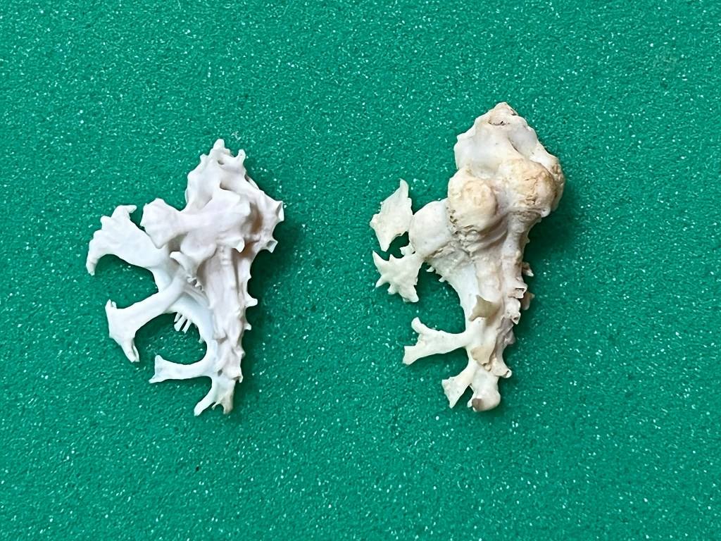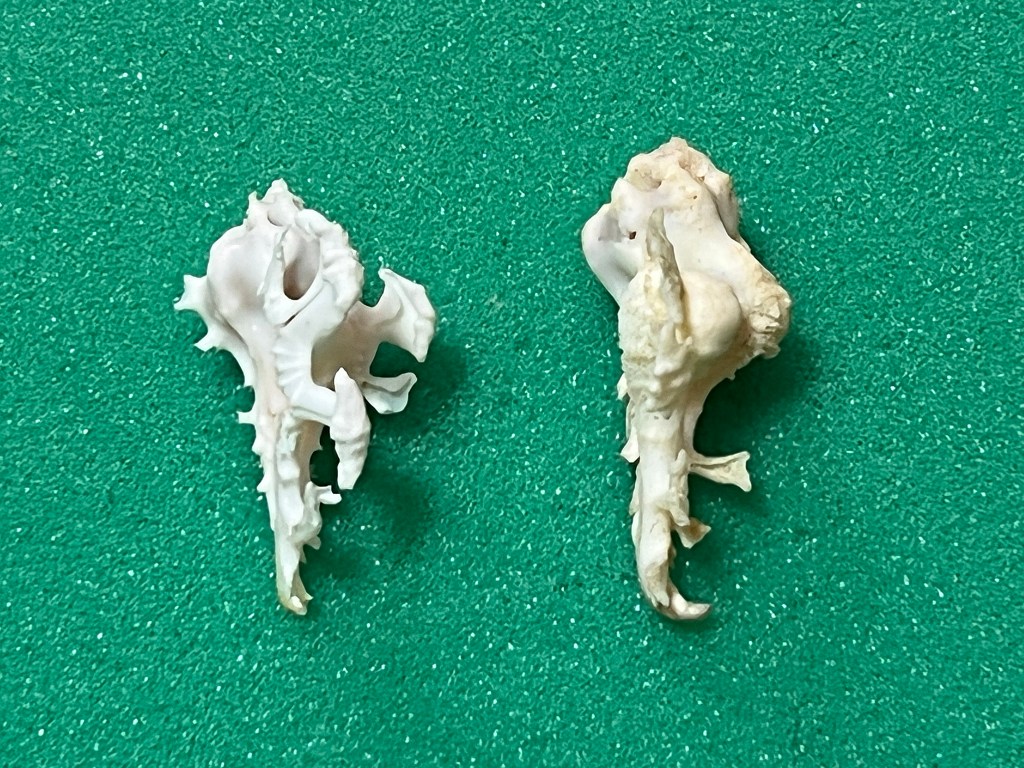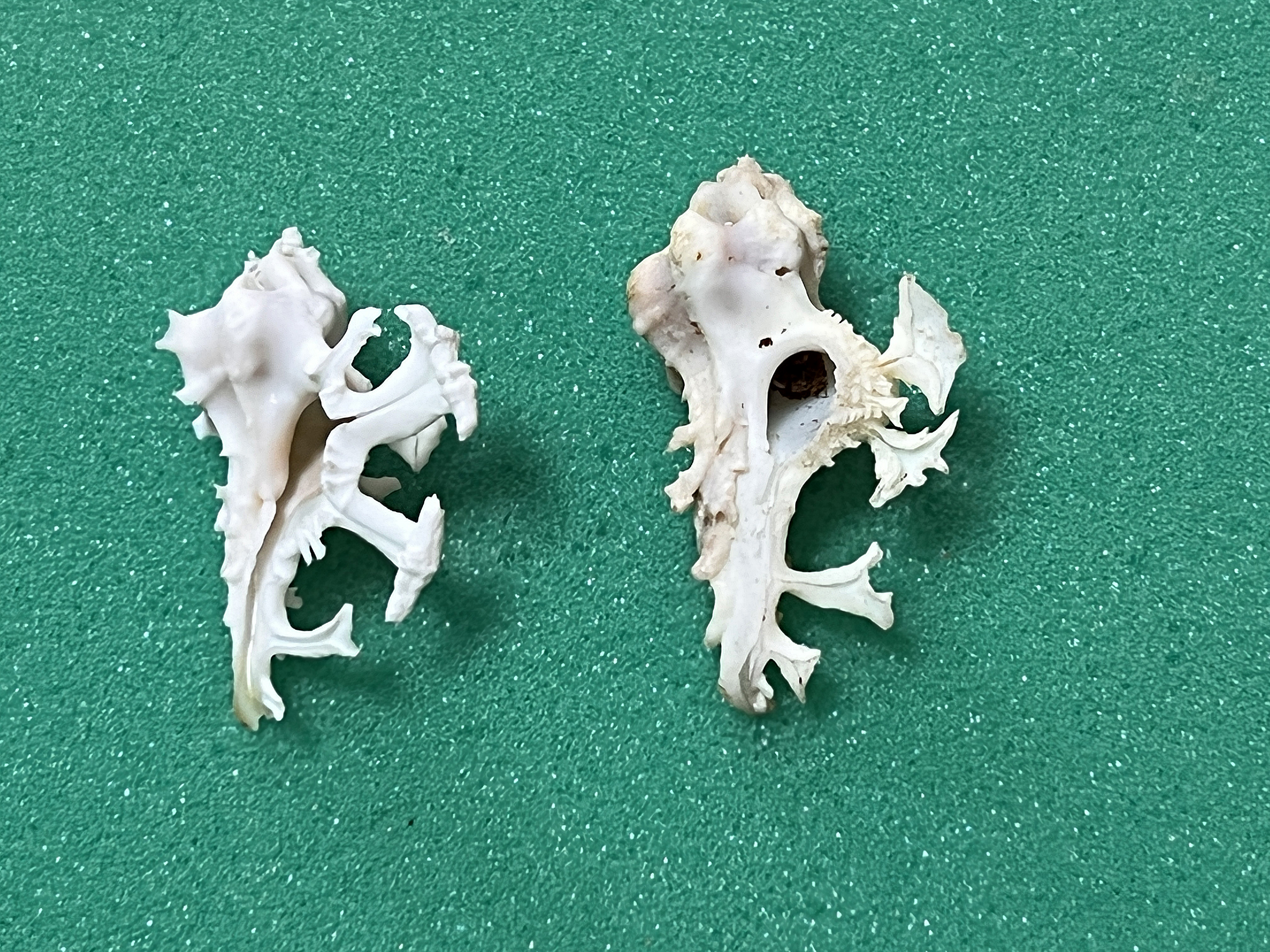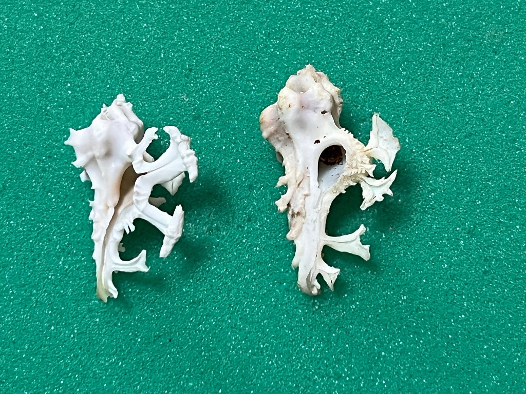 Both are extremely similar with a dominant body while and large varices that look like webbed feet at the termination of growth. The difference being that Zamboi shoot out varies at the end of each growth cycle and in Pele a knob is formed instead Pele is generally larger. This specimens small to make a a better comparison. Adult size is between 2 and 3 inches.