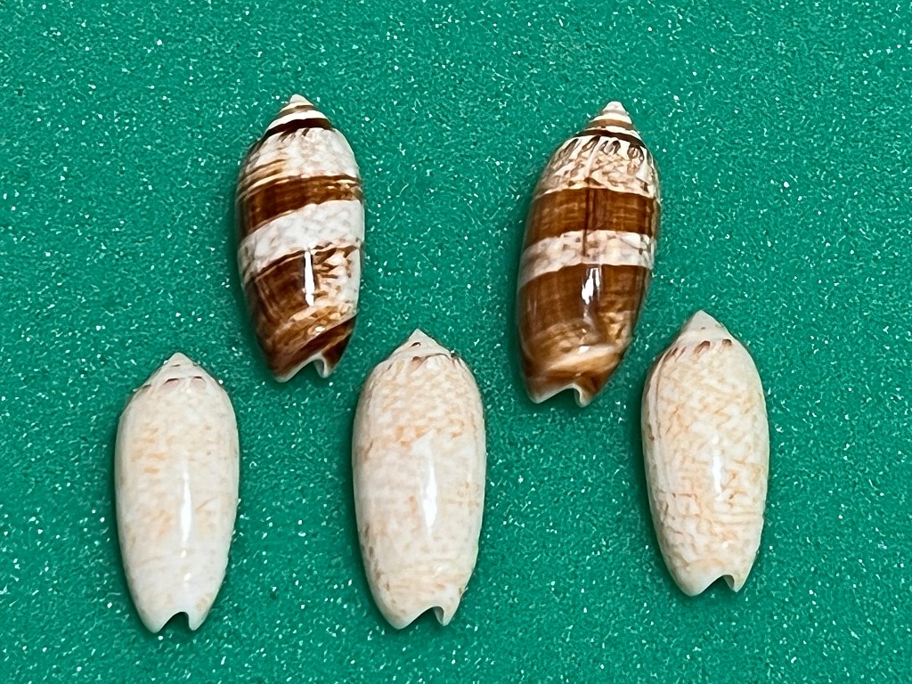 This attractive little olive of about one an a half to two inches in length comes in three varieties. The common is wheat colored and completely covered with fine dashes and lines. The second variety is milk white and almost void of decoration. The third has two chocolate brown bands that wide in width as the shell grows. The varieties appear to be location specific.