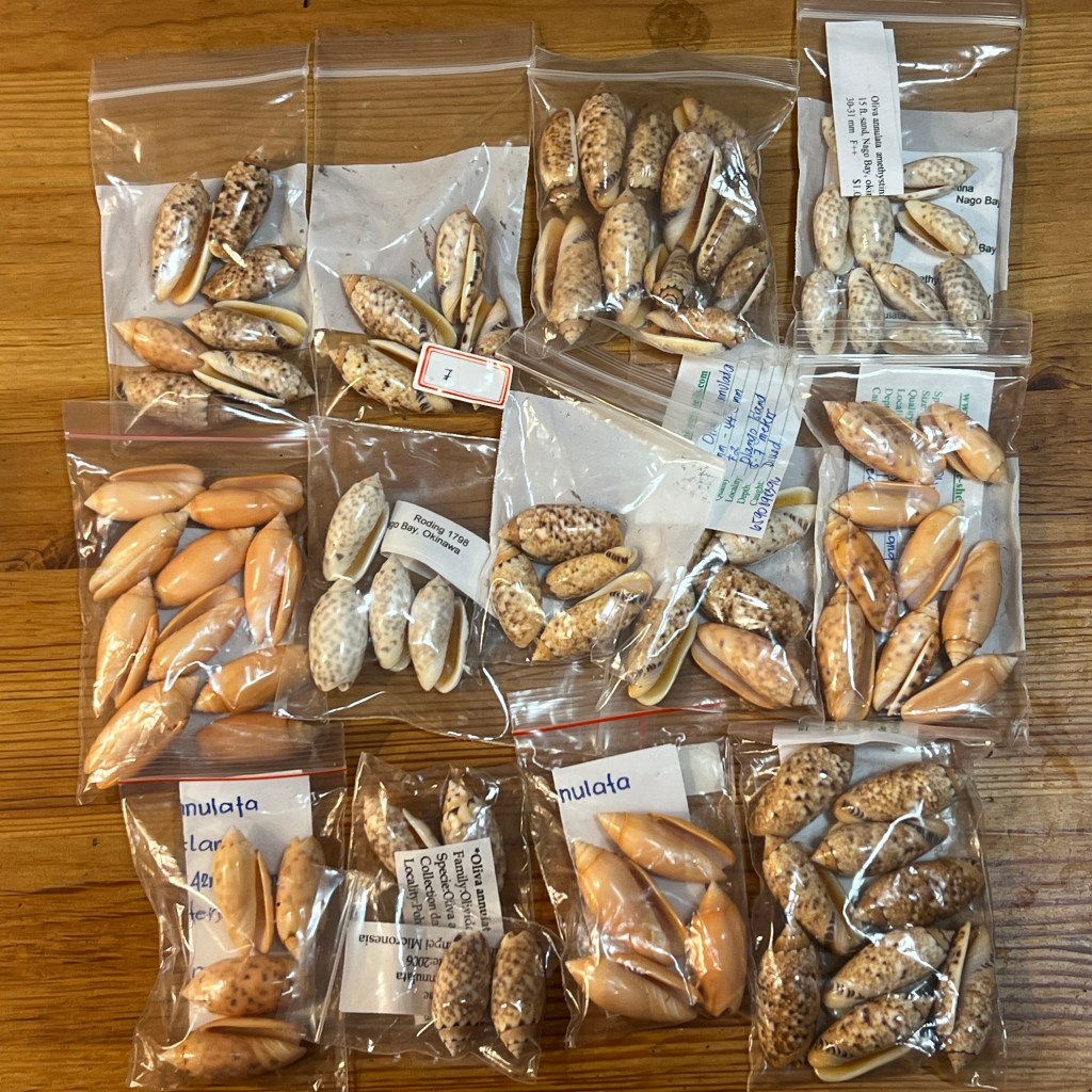 The photo below is of my collection of Amethyst Olivesfrom which these specimens were selected. The are Pacific Ocean shells found mostly in the Philippines. They range from Okinawa south to Indonesia and to the east to the Marshal Islands. .
