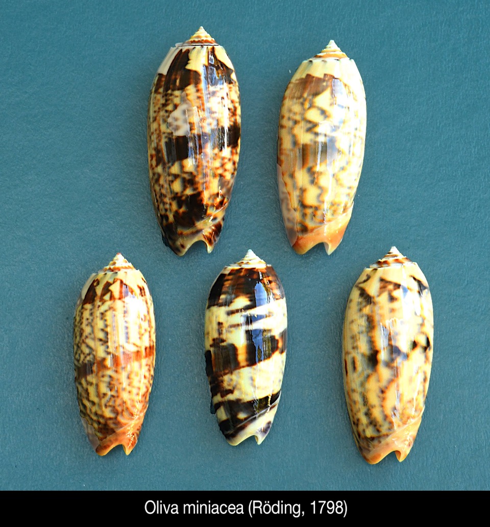 *61. 5 Oliva miniacea w/data, Philippines. Contrasting pattern set of 5.
